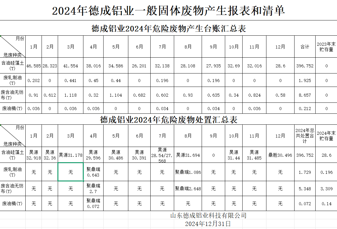2024年德成鋁業一般固體廢物產生報表和清單